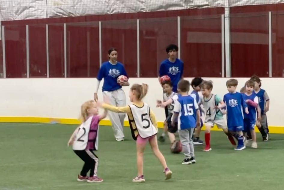 With ten minutes left, all 14 kids huddled up. The coaches put white pinnies on half of them. It was 7-on-7.