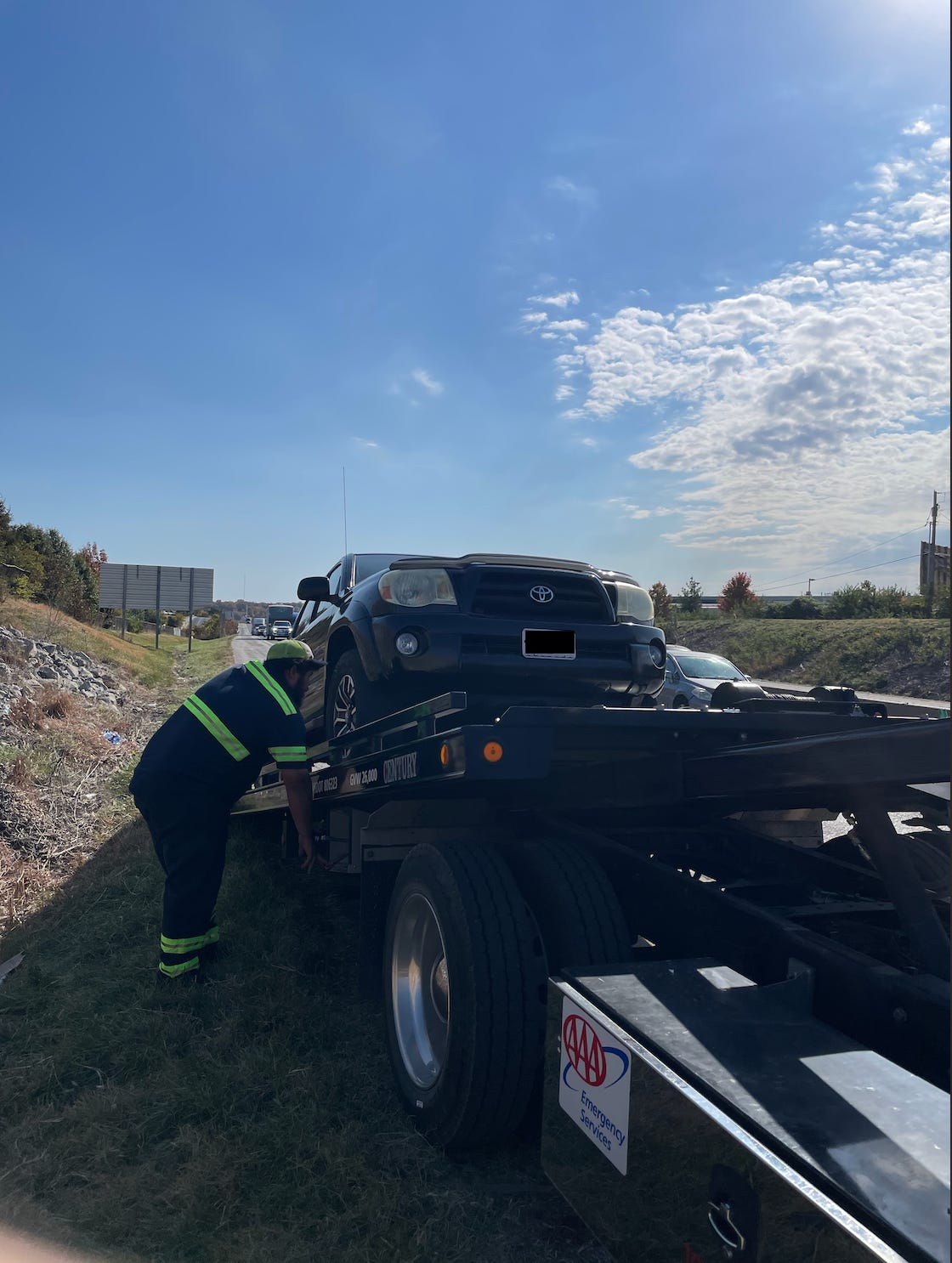 I found the info and called to report the incident. “A tow truck is on the way ma’am. ”